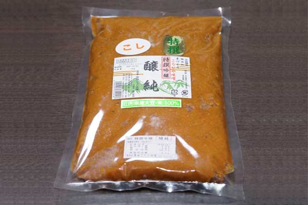 16分米こうじ味噌:米こうじ歩合16割(米16:大豆:10)山形県産はえぬき米100%、山形県産里のほほえみ種大豆100%使用で、すべての原料に上こうじ味噌よりさらにこだわって米は山形県産はえぬき米100%を使用しています。ただ今販売中の味噌は、10〜12ヶ月間熟成の天然醸造味噌で黄白色よりやや赤色系の中甘口(京都などの甘口味噌ほど甘くない)の「粒」タイプ味噌です。(天然醸造のため熟成期間や色のすすみ具合は気候又は季節によって異なります。)「こし」タイプは注文を受けてから、こし味噌にするため、2日〜14日位かかります。